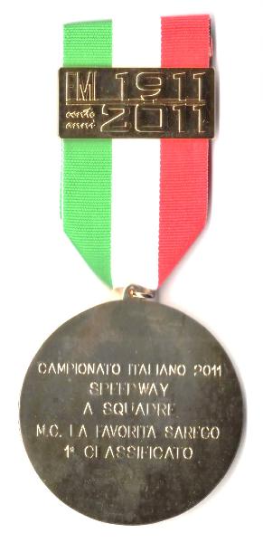 2011 MOTO CLUB LA FAVORITA SAREGO 26/09/2011 a Terenzano (UD), dopo 4 gare 1° Classificato nel Campionato Italiano Speedway a Squadre – Internazionali d’Italia Piloti italiani: Nicolas Covatti, Andrea Maida, Jonatha Seren Piloti stranieri): M. Hadek (CZ), T. Stange (D), S. Ulameck e K. Jablonski (PL)