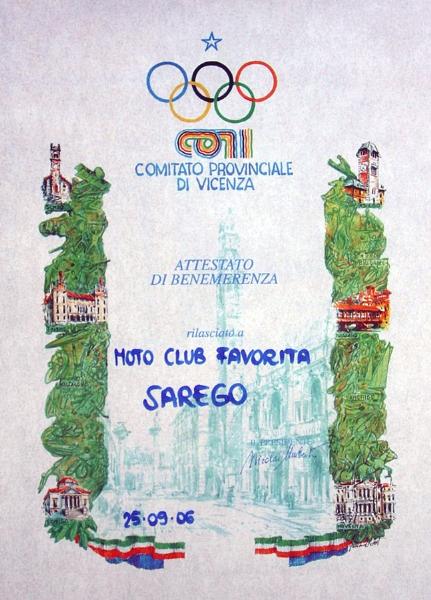 CONI VICENZA 2013 Verso la fine della stagione 2013 è stata comunicata dal CONI Provinciale al MOTO CLUB LA FAVORITA SAREGO l'assegnazione della STELLA DI BRONZO al merito sportivo. Questo prestigioso riconoscimento è stato consegnato durante la Festa dello Sport del Coni di Vicenza il 6 Dicembre 2013.